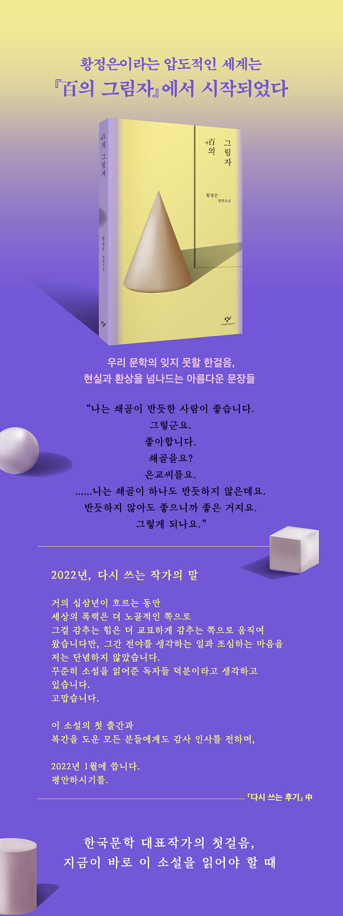 ȲÁ¤ÀºÀÇ Ã¹ ÀåÆí¼Ò¼³ ¡ºÛÝÀÇ ±×¸²ÀÚ¡»°¡ »õ·Î¿î ÀåÁ¤°ú Á¤Á¦µÈ ¹®ÀåÀ¸·Î ´Ù½Ã Ãâ°£µÇ¾ú´Ù. ¾Æ¸§´ä°íµµ µ¶Æ¯ÇÑ °³¼ºÀ¸·Î ÀڽŸ¸ÀÇ ¹®Çпµ¿ªÀ» °ø°íÈ÷ ±¸ÃàÇÑ È²Á¤ÀºÀº ÀÌ¹Ì ±× À̸§¸¸À¸·Î ½Å·Ú¹Þ´Â ÀÛ°¡Áö¸¸, ¡ºÛÝÀÇ ±×¸²ÀÚ¡»´Â ±× ¾ÐµµÀûÀÎ ¼¼°è°üÀÇ Ãâ¹ßÀ» ¾Ë¸° ÀÛǰÀ¸·Î¼ ´õ¿í ºûÀ» ¹ßÇÑ´Ù. ÀÌ ÀÛǰÀº 2010³â ÃÊÆÇ Ãâ°£ ´ç½ÃºÎÅÍ ¹®Çа迡 Å« ¹ÝÇâÀ» ºÒ·¯ÀÏÀ¸Å°¸ç ¡®È²Á¤Àº½Ä¡¯ ¡®È²Á¤ÀºÇ³¡¯ µîÀÇ ¿ë¾î¸¦ À¯Çà½ÃŲ ¹Ù ÀÖÀ¸¸ç, ¿¬±ØÀ̳ª ¸¸È µî µ¶ÀÚµéÀÇ ÀÚ¹ßÀûÀÎ 2Â÷ âÀÛ¹°·Î Á¦À۵ǾúÀ» ¸¸Å ³²´Ù¸¥ »ç¶ûÀ» ¹Þ¾Æ¿Ô´Ù. Çö½Ç°ú ȯ»óÀ» ³Ñ³ªµå´Â ±â¹ßÇÑ »ó»ó·Â°ú ȲÁ¤Àº¸¸ÀÇ ÀÎÀåÀÌ »õ°ÜÁø ¹®ÀåÀ¸·Î ½º·¯Áö´Â µµ½Ã¿¡¼ »ì¾Æ°¡´Â »ç¶÷µéÀÇ À¯´ë¿Í DzDzÇÑ ¿¬¾Ö°¨Á¤À» Àý¹¦ÇÏ°Ô Çü»óÈÇÑ ¡ºÛÝÀÇ ±×¸²ÀÚ¡»´Â ¾ÖƶÇÏ°íµµ µû¶æÇÏ°Ô µ¶ÀÚµéÀÇ ¸¶À½À» °¨µ¿½ÃŲ´Ù.