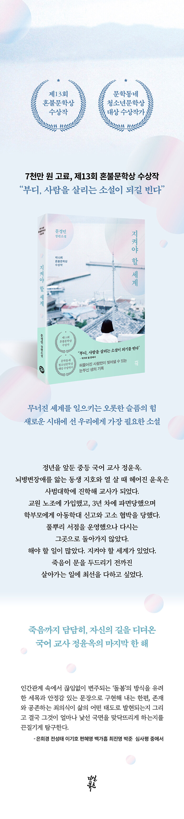 ´ç¼±ÀÚ ¹®°æ¹Î ÀÛ°¡´Â û¼Ò³â¼Ò¼³ ¡ºÈÇÈÇ¡»·Î ¹®Çе¿³×û¼Ò³â¹®Çлó°ú ±ÇÁ¤»ý ¹®ÇлóÀ» ¼ö»óÇÑ ¼Ò¼³°¡ÀÌÀÚ, ÃʵîÇб³¿¡¼ ±Ù¹«ÇÏ´Â ±³»ç´Ù. ÀÛ°¡´Â ´ç¼±ÀÛÀÌ ¡°ºÎµð »ç¶÷À» »ì¸®´Â ¼Ò¼³ÀÌ µÇ±â¸¦ ºó´Ù¡±°í ÀÛ°¡ÀÇ ¸» ¸»¹Ì¿¡ ¹àÇû´Ù. ¼Ò¼³À» Å»°íÇÑ µÚ ¹àÈ÷´Â ¼Òȸ°¡ ÀÌÅä·Ï ³²´Ù¸¥ °ÍÀº Áö±ÝÀÇ ½Ã´ë°¡ °Þ´Â ÁßÀÎ °¡½¿ ¾ÆÇ »ç°Çµé°úµµ ¹«°üÇÏÁö ¾ÊÀ» Å×´Ù. ¡ºÁöÄÑ¾ß ÇÒ ¼¼°è¡»´Â ºÒÀÇÀÇ »ç°í·Î Á×À½À» ¸ÂÀÌÇÑ °íµîÇб³ ±¹¾î ±³»ç Á¤À±¿ÁÀÇ »îÀ» ÂùÂùÈ÷ Åì´Â´Ù. À±¿ÁÀÇ ÀλýÀÌ ³ª¿µÇ´Â ¼Ò¼³ÀÇ µµÀԺο¡¼ ÃÖ±Ù ÀÏ¾î³ ¿©·¯ ÀÏÀ» ¶°¿Ã¸®´Â °Ç ¾î·Á¿î ÀÏÀÌ ¾Æ´Ï´Ù. Á×À½¿¡ ±¼º¹ÇØ ¹ö¸° ÁÙ ¾Ë¾Ò´ø ÇÑ Àΰ£ÀÌ ½ÇÀº ÀڽŰú ¼¼»óÀÇ Á¸¾öÀ» Áö۱â À§ÇØ ²÷ÀÓ¾øÀÌ ³ë·ÂÇØ ¿ÔÀ½À» º¸¿©ÁÖ¸é¼, À̾߱â´Â µ¶ÀÚ¿¡°Ô Àͼ÷ÇÏ°íµµ ³¸¼± Áú¹®À» °Ç³Ù´Ù. ´ç½ÅÀº ¾î¶»°Ô »ì¾Æ¿Ô´À³Ä°í, ±×¸®°í ¾î¶»°Ô »ì¾Æ°¥ °ÍÀ̳İí.