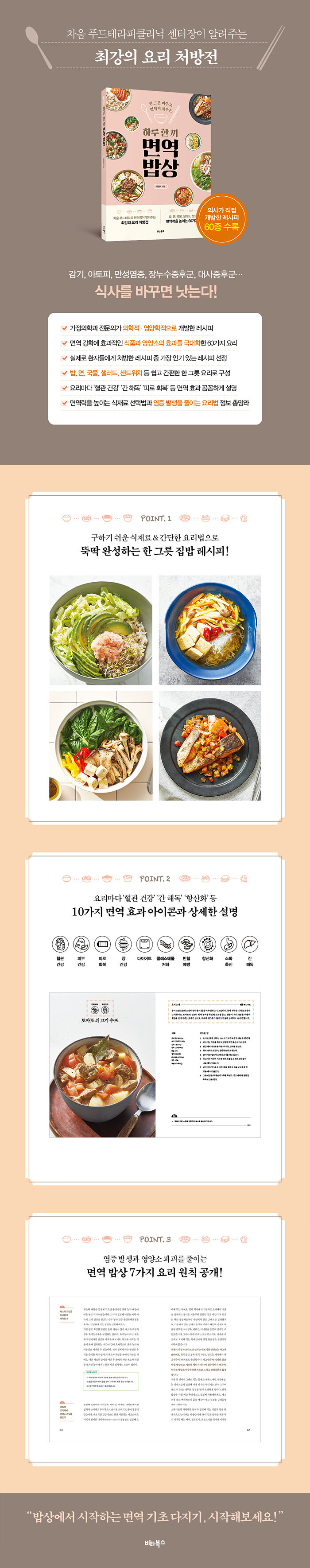Ã¥¿¡¼´Â ¸¸¼º¿°ÁõÀ» ÁÙÀÌ°í ¸é¿ª·ÂÀ» ³ôÀÌ´Â 60°¡Áö ¿ä¸®¸¦ ¼Ò°³ÇÑ´Ù. ¹ä, ¸é, ±¹¹°, »ø·¯µå, »÷µåÀ§Ä¡ µî ½±°í °£ÆíÇÑ ÇÑ ±×¸© ¿ä¸®·Î ±¸¼ºÇß´Ù. ¿ä¸®¸¶´Ù ¡®Ç÷°ü °Ç°¡¯ ¡®°£ ÇØµ¶¡¯ ¡®Ç×»êÈ¡¯ µî ¸é¿ª È¿°ú¸¦ ²Ä²ÄÇÏ°Ô ¼³¸íÇß´Ù. ´õºÒ¾î ¸é¿ª·ÂÀ» ³ôÀÌ´Â ½ÄÀç·á ¼±Åùý°ú ¿°Áõ À¯¹ßÀ» ÁÙÀÌ´Â ¿ä¸®¹ý µî ¸é¿ª ¹ä»óÀ» Â÷¸®´Â ±âº»±âµµ ¾Ë·ÁÁØ´Ù. ´©±¸³ª ÇÏ·ç ÇÑ ³¢·Î °¡º±°Ô ½ÃÀÛÇϱâ ÁÁ´Ù.