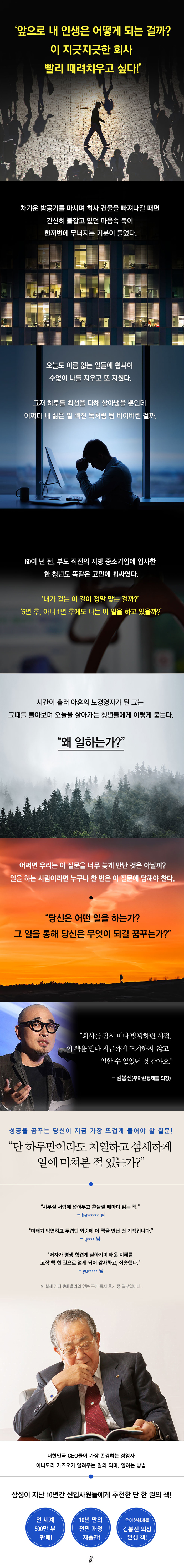 ÀÌ Ã¥Àº ¡®ÀÏÀ» ´õ ÀßÇÏ·Á¸é ÀÌ·¸°Ô ÇÏ¶ó¡¯°í ¹æ¹ý·ÐÀ» ¾Ë·ÁÁִ åÀÌ ¾Æ´Ï´Ù. ¡®±×·¸°Ô ÀÏÇÏ¸é ¾È µÈ´Ù¡¯°í ÈÆ°èÇÏÁöµµ ¾ÊÀ¸¸ç, ¡®Áö±Ý±îÁö ÃæºÐÈ÷ ÀßÇßÀ¸´Ï ÀÌÁ¦ ±×¸¸ ½¬¾îµµ ÁÁ´Ù¡¯°í À§·ÎÇØÁÖÁöµµ ¾Ê´Â´Ù. Æò¹üÇϱâ ¦ÀÌ ¾ø´Â ÇÑ ³²ÀÚ°¡ Àλý¿¡¼ µµ¸ÁÄ¡Áö ¾Ê°í ½º½º·Î Ÿ¿Ã¶ó ÃÖ°í°¡ µÈ °úÁ¤°ú °í¹ÎÀ» ¼ÖÁ÷ÇÏ°Ô °í¹éÇßÀ» »ÓÀÌ´Ù. ¡°¿Ö ÀÏÇϴ°¡?¡± ¿½ÉÈ÷ ÀÏÇϸ鼵µ Á¤ÀÛ ±× ÀÌÀ¯¿¡ ´ëÇØ¼´Â ½±»ç¸® ´äÇÏÁö ¸øÇÏ´Â »ç¶÷À̶ó¸é, ÁøÀÌ ºüÁö°Ô ÀÏÇÑ µÚ ÁöÇÏöÀ» Ÿ°í ÁýÀ¸·Î Åð±ÙÇÏ´Ù°¡ ¹®µæ ¸ô¾ÆÄ¡´Â °øÇãÇÔ¿¡ È۽ο©º» Àû ÀÖ´Â »ç¶÷À̶ó¸é, ±×Àú ¼º½ÇÇÏ°Ô »ì¾ÒÁö¸¸ ¼ø½Ä°£¿¡ ¹ú¾îÁø ÀÚ»ê °ÝÂ÷¿¡ ¹«·Â°¨À» ´À³¢°í ÀÖ´Â »ç¶÷À̶ó¸é ´õ ´Ê±â Àü¿¡ ÀÌ Ã¥À» ÅëÇØ ÀλýÀÇ °¡Àå Áß¿äÇÑ Áú¹®À» ¸¸³ªº¸±â ¹Ù¶õ´Ù.