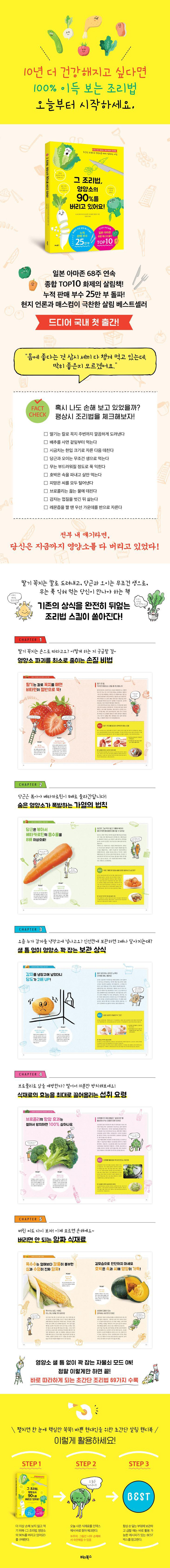 ÀÌó·³ ÁöÄÉÀÌÀÇ´ë¿¡¼´Â ±¸Ã¼ÀûÀÎ µ¥ÀÌÅ͸¦ ÅëÇØ ±×µ¿¾È »ó½ÄÀ¸·Î ¾Ë·ÁÁ³´ø Á¶¸®¹ýÀÌ ¾ó¸¶³ª ¿µ¾ç¼Ò¸¦ ÆÄ±«Çϰí ÀÖ¾ú´ÂÁö ¾Ë·ÁÁØ´Ù. ½ÉÁö¾î µ¶Àڵ鿡°Ô ½Å¼±ÇÑ Ãæ°ÝÀ» ÁÖ´Â °Í¸¸À¸·Î ÀÌ Ã¥Àº ³¡³ªÁö ¾Ê´Â´Ù. ³» °¡Á·ÀÇ °Ç°À» À§ÇØ ½Ä»ç¸¦ ÁغñÇÏ´Â À̵éÀÌ ¾Æ±î¿î ¿µ¾ç¼Ò ¼Õ½ÇÀ» ¸·°í ÁÁÀº ¿µ¾ç¼Ò´Â 120% ²ø¾î¿Ã¸± ¼ö ÀÖµµ·Ï ½ÄÀç·á ¼ÕÁú¹ý, ÀÍÈ÷´Â ¹ý, º¸°ü¹ý, ¸Ô´Â ¿ä·É, ¹ö¸®Áö ¾Ê´Â ¹ý, »óȲº° ½ÄÀç·á ¼±Åà ¹æ¹ý ÀÌ·¸°Ô ÃÑ 6°¡ÁöÀÇ °¡Àå Çö¸íÇÏ°Ô ¸Ô´Â ¹æ¹ýÀ» °ø°³ÇÑ´Ù. ¿ì¸®°¡ ÀÚÁÖ ¸Ô´Â ½ÄÀç·á¸¶´Ù ½±°í ÀÚ¼¼ÇÑ ¼³¸í°ú Á¶¸® ÆÁÀ» ¼ö·ÏÇØ¼ ÇÑ ´«¿¡ Çٽɸ¸ ½ï½ï ±â¾ïÇÒ ¼ö ÀÖ´Ù´Â °ÍÀÌ ÀåÁ¡ÀÌ´Ù. Ã¥ ¼Ó °÷°÷¿¡ Àд Àç¹Ì¸¦ Ã¥ÀÓÁö´Â ±Í¿©¿î ÀÏ·¯½ºÆ® ¶ÇÇÑ °¡µæÇØ ¼ÒÀå °¡Ä¡¸¦ ¿Ã·È´Ù. ÇÑ °¡Á¤ÀÇ ½ÄŹÀ» Ã¥ÀÓÁö°í ÀÖ´Ù¸é ÁÖ¸ñÇÏÀÚ. ¿ä¸®Çϱâ Á÷Àü ÀÚ²Ù µé¿©´Ùº¸°Ô µÇ´Â µçµçÇÑ »ì¸² ÇʼöÅÛÀÌ µÇ¾î ÁÙ °ÍÀÌ´Ù