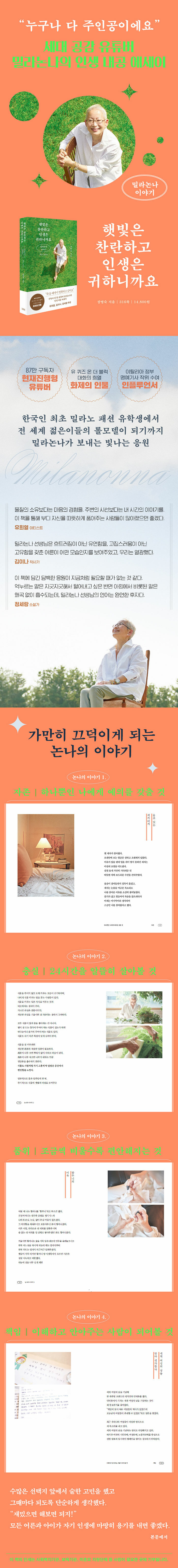 ¡ºÇÞºûÀº Âù¶õÇϰí ÀλýÀº ±ÍÇϴϱî¿ä¡»´Â ¿Ï°íÇÑ °íÁýº¸´Ù À¯¿¬ÇÑ ¼Ò½ÅÀ» °¡Áø ¹Ð¶ó³í³ªÀÇ Àλý ³»°øÀ» ´ãÀº ¿¡¼¼ÀÌ´Ù. ¡°Çϳª»ÓÀÎ ³ª¿¡°Ô ¿¹ÀǸ¦ °®¡±Ãß¸é¼ ¡°ÀÌÇØÇÏ°í ¾È¾ÆÁÖ´Â »ç¶÷ÀÌ¡± µÇ±â±îÁöÀÇ °úÁ¤ÀÌ °í½º¶õÈ÷ ´ã°Ü ÀÖ°í, Æò»ý ½×ÀÎ °æÇè°ú ÁöÇý°¡ ¿À·ÔÀÌ ½º¸ç ÀÖ´Ù. ¼¼¿ùÀÇ È帧¿¡ µû¶ó ÀÚ¿¬½º·¹ ½ÀµæÇÑ ºÀ»ç¿Í °Ë¾àÀÇ »ýȰ öÇаú Áö¼Ó°¡´ÉÇÑ »îÀ» À§ÇÑ Á¶¾ðÀ» ÀüÇϰí, À¯Æ©ºê¿¡¼ ¸ø´Ù ÇÑ ¼Ó ±íÀº À̾߱⵵ Ç®¾î³õ¾Æ ÁøÂ¥ ¸ÚÀÌ ¹«¾ùÀÎÁö »ý°¢ÇÏ°Ô ÇÑ´Ù.