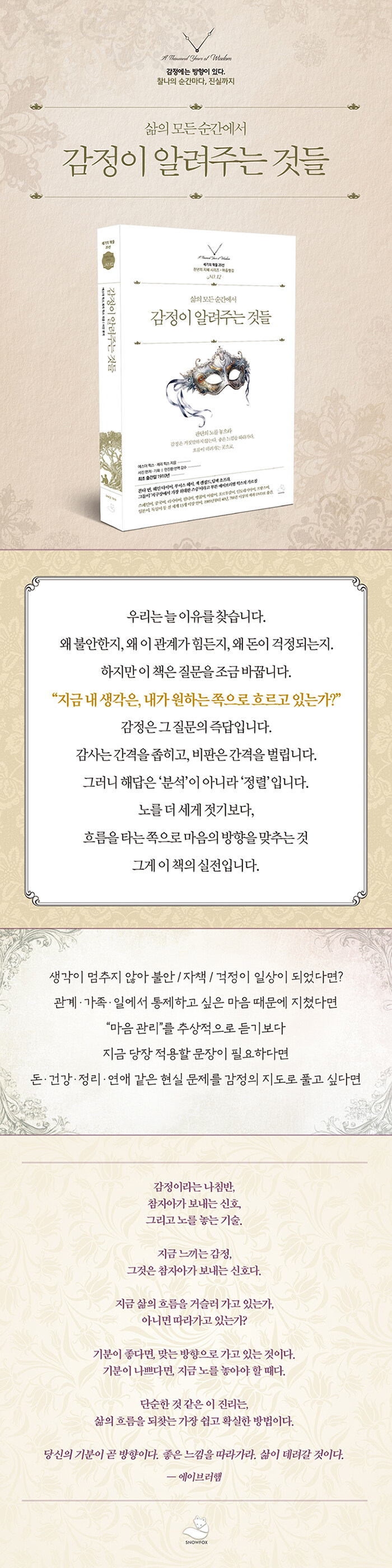¡º°¨Á¤ÀÌ ¾Ë·ÁÁÖ´Â °Íµé¡»Àº ´º¿åŸÀÓ½º º£½ºÆ®¼¿·¯ ÀúÀÚ ¿¡½º´õ Èø½º¿Í Á¦¸® Èø½º°¡ ¿¡À̺귯ÇÜÀÇ °¡¸£Ä§À» ´ã¾Æ 2007³â Hay House¿¡¼ Ãâ°£ÇÑ Ã¥ÀÌ´Ù. ¿¡½º´õ¿Í Á¦¸® Èø½º´Â 1989³âºÎÅÍ ¸Å³â ÃÖ´ë 60°³ µµ½Ã¿¡¼ ¿öÅ©¼óÀ» ÁøÇàÇØ¿ÔÀ¸¸ç, ÇöÀç±îÁö 700Á¾ ÀÌ»óÀÇ Ã¥¡¤Ä«¼¼Æ®¡¤CD¡¤DVD¸¦ ÃâÆÇÇß´Ù. ÀüÀÛ ¡º²ø¾î´ç±èÀÇ ¹ýÄ¢(The Law of Attraction)¡»Àº ´º¿åŸÀÓ½º º£½ºÆ®¼¿·¯ 2À§¿¡ ¿Ã¶ú°í, ¡ºAsk and It Is Given¡»Àº Ãâ°£ ÀÌÈÄ ¾Æ¸¶Á¸ Àüü µµ¼ »óÀ§ 100À§±ÇÀ» °ÅÀÇ ¸ÅÀÏ À¯ÁöÇÏ¸ç ¿ÀÇÁ¶ó À©ÇÁ¸®¿Í °øµ¿ ¶óµð¿À ÇÁ·Î±×·¥À» ÁøÇàÇϱ⵵ Çß´Ù. ÀÌ Ã¥ÀÇ ÇÙ½ÉÀº '°¹°ÀÇ ºñÀ¯'´Ù. ¿¡À̺귯ÇÜÀº ÀÌ È帧À» 'ÇÏ·ù(downstream)'¿Í '¿ª·ù(upstream)'·Î ¼³¸íÇÑ´Ù.