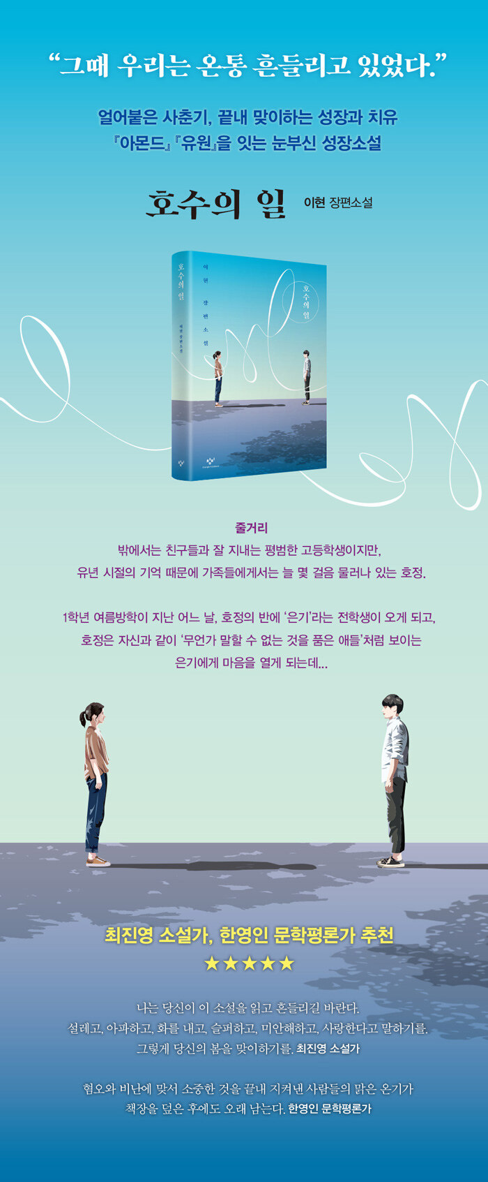 ¼ºÀåÇÏ´Â À̵éÀÇ ¸¶À½À» ¼¼¹ÐÈ÷ »ìÆì ¿Â ÀÌÇö ÀÛ°¡ÀÇ ½ÅÀÛ ÀåÆí¼Ò¼³ ¡ºÈ£¼öÀÇ ÀÏ¡»ÀÌ Ãâ°£µÇ¾ú´Ù. ¿Àϰö »ì ÁÖÀΰø È£Á¤ÀÌ Àº±â¿Í ¸¸³ª °æÇèÇÏ´Â ¼³·½°ú »ç¶û, °¢ÀÚÀÇ »óó¸¦ µó°í ÀϾ °úÁ¤À» ´ã¾Ò´Ù. Á¤ÀÇÇÏÁö ¸øÇØ È¥¶õ½º·¯¿î °¨Á¤µéÀ» ¸Å¸¸Áö´Â Ź¿ùÇÑ ¹®ÀåÀÌ µ¸º¸À̸ç, ù»ç¶ûÀÇ µÎ±Ù°Å¸²»Ó ¾Æ´Ï¶ó °¡Á·, Ä£±¸¿ÍÀÇ °¥µî°ú ¿Ü·Î¿ò µî ÇѰ¡Áö·Î Á¤¸®µÇÁö ¾Ê´Â ¿©·¯ °¥·¡ÀÇ ±íÀº ¸¶À½À» ¼¶¼¼ÇÏ°Ô Æ÷ÂøÇß´Ù. °Ü¿ïó·³ Ȥµ¶ÇÏ°Ô ½Ê ´ëÀÇ ½Ã°£À» Åë°úÇÑ À̵é, ½±°Ô ²¨³¾ ¼ö ¾ø´Â ¸¶À½À» °£Á÷ÇÑ À̵鿡°Ô ±íÀº °ø°¨À» ºÒ·¯ÀÏÀ¸Å°¸ç ´«ºÎ½Å Ä¡À¯ÀÇ ¼ø°£À» ±æ¾î ¿Ã¸®´Â ¼ºÀå¼Ò¼³ÀÌ´Ù.