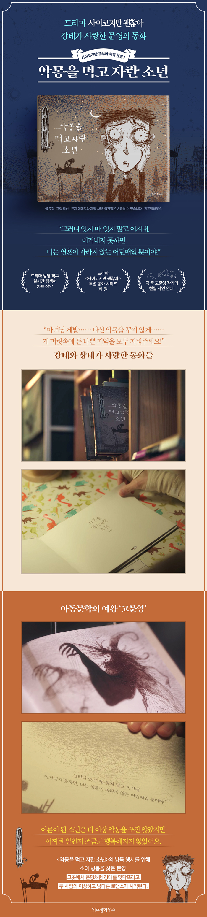 ¡º¾Ç¸ùÀ» ¸Ô°í ÀÚ¶õ ¼Ò³â¡»Àº ÀØ°í ½ÍÀº °ú°ÅÀÇ ³ª»Û ±â¾ïµéÀ» Áö¿ì±â À§ÇØ ¸¶³à¸¦ ã¾Æ°¡ ¿µÈ¥À» °Å·¡ÇÏ´Â ¼Ò³âÀÇ À̾߱⸦ °ÇÁ¶ÇÏ°í ¾îµÎ¿î ±×¸²Ã¼·Î ±×·Á³½ ¡®»çÀÌÄÚÁö¸¸ ±¦Âú¾Æ Ưº° µ¿È ½Ã¸®Á ù ¹øÂ° ±×¸²Ã¥ÀÌ´Ù. ¡º¾Ç¸ùÀ» ¸Ô°í ÀÚ¶õ ¼Ò³â¡»ÀÇ ³¶µ¶ Çà»ç¸¦ ÁøÇàÇϱâ À§ÇØ ¼Ò¾Æ º´µ¿À» ãÀº ¹®¿µÀº ±×°÷¿¡¼ ¿î¸íó·³ °Å¸¦ ¸Â´Ú¶ß¸®°í, µÎ »ç¶÷ÀÇ ÀÌ»óÇÏ°í ³²´Ù¸¥ ·Î¸Ç½º°¡ ½ÃÀ۵ȴÙ.