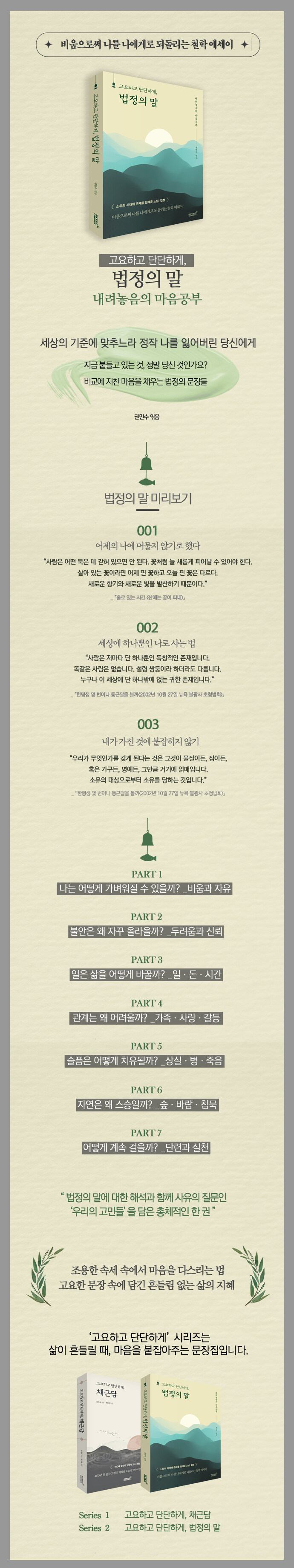 ¿ì¸®´Â ³Ê¹« ¸¹Àº °ÍÀ» ¾Ë°í, ³Ê¹« ¸¹Àº °ÍÀ» º¸°í, ³Ê¹« ¸¹Àº °ÍÀ» ¿ä±¸¹Þ´Â ½Ã´ë¸¦ »ì¾Æ°©´Ï´Ù. Á¤º¸´Â ºü¸£Áö¸¸ ¸¶À½Àº µû¶ó°¡Áö ¸øÇϰí, ¼±ÅÃÁö´Â ¸¹Áö¸¸ È®½ÅÀº ÁÙ¾îµç´Ù. ´õ ³ªÀº »îÀ» À§ÇØ ¾Ö¾²´Âµ¥µµ ÀÌ»óÇÏ°Ô »îÀº ´õ ¾ã¾ÆÁö°í, °ü°è´Â ´õ ¿¹¹ÎÇØÁö¸ç, ÇÏ·ç´Â ´õ ½±°Ô ¼ÒÁøµÈ´Ù. ¹ýÁ¤ ½º´ÔÀÇ ¸»ÀÌ ÇÊ¿äÇÑ ÀÌÀ¯´Â ¹Ù·Î ¿©±â¿¡ ÀÖ´Ù. ½º´ÔÀÇ ¹®ÀåÀº ¿ì¸®¿¡°Ô È®½ÇÇÑ ÇØ´äÀ» Áֱ⺸´Ù´Â, ÇØ´äÀ» °¡·Î¸·´Â ȥŹÇÑ ¸¶À½ÀÇ »óŸ¦ ¸ÕÀú Á¤¸®ÇÏ°Ô ÇÑ´Ù. ÀÌ Ã¥Àº ¹ýÁ¤ ½º´ÔÀÇ ´Ü¼ø Àú¼ ¹®Àå¿¡¸¸ ±â´ëÁö ¾Ê°í, ´ëÇ¥ Àú¼µé»Ó ¾Æ´Ï¶ó °¿¬Áý°ú ¹ý¹® ±â·Ï, Á¤±â ¹ýȸ¿¡¼ ½ÇÁ¦·Î °Ç³Ù ¸»¾¸, ¿©·¯ ÀÚ¸®¿¡¼ ȸÀÚµÇ¾î ¿Â ÇÙ½É ¹®Àåµé±îÁö Æø³Ð°Ô ¿«¾î, '¹ýÁ¤ÀÇ ¸»'À» ÇϳªÀÇ ÃÑüÀûÀÎ È帧À¸·Î ¸¸³¯ ¼ö ÀÖµµ·Ï ±¸¼ºÇß´Ù.