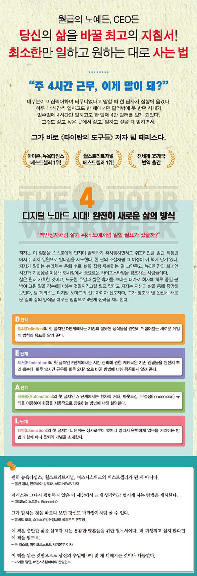 ÀÌ°Ô °¡´çŰ³ª ÇÑ ¸»Àΰ¡ ½Í°ÚÁö¸¸ ½ÇÁ¦ ±×ÀÇ »îÀ» ÅëÇØ Áõ¸íÇÑ´Ù. ÀúÀÚ´Â ¿©ÀüÈ÷ ¿ì¸®¿¡°Ô »ý¼ÒÇÑ µðÁöÅÐ ³ë¸¶µå, Áï ÀÎÅͳÝÀÇ º¸±Þ°ú ±â¼úÀÇ ¹ßÀüÀ¸·Î ¡®¿ø°Ý ±Ù¹«¡¯¸¦ ÇÏ¸é¼ ½Ã°£°ú °ø°£À» ÀÚÀ¯·Ó°Ô ¼±ÅÃÇϸç ÀÏÇÏ´Â ¹æ½ÄÀÇ ¼±±¸ÀÚ¿´´Ù. ±×¸®ÇÏ¿© °¡´ÉÇÏ°Ô µÈ ¡®ÁÖ 4½Ã°£ ±Ù¹«¡¯ À̾߱⸦ ÀÌ Ã¥¿¡ °Åħ¾øÀÌ Ç®¾î³½´Ù. Ã¥À» Àд٠º¸¸é ¹Ï¾îÁø´Ù. Á¤¸»·Î ±×·¸°Ô µÉ °Í¸¸ °°Àº ±âºÐÀÌ µç´Ù. ABC News°¡ ÆòÇßµíÀÌ ¡°ÀÌ Ã¥ÀÌ ±¦È÷ ´º¿åŸÀÓ½º, ¿ù½ºÆ®¸®Æ®Àú³Î, ºñÁî´Ï½ºÀ§Å©ÀÇ º£½ºÆ®¼¿·¯ 1À§¿¡ ¿À¸¥ °Ô ¾Æ´Ï´Ù.¡±¶ó´Â ´À³¦ÀÌ ÆÅÆÅ ¿Â´Ù.