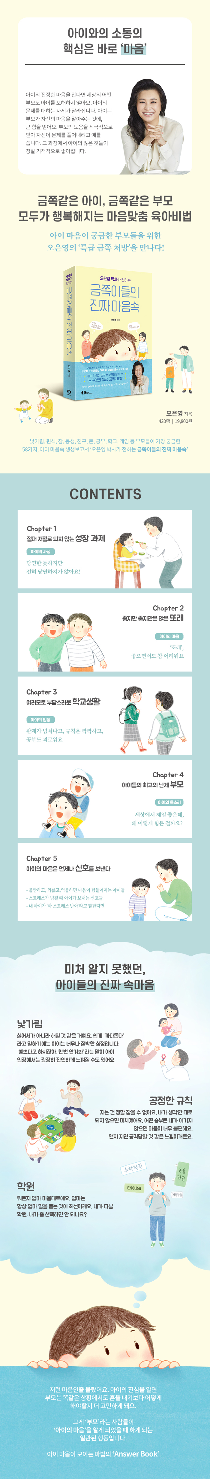 ÀÌ Ã¥Àº ¾ÆÀ̸¦ Ű¿ì¸é¼ ºÎ¸ðµéÀÌ °¡Àå ´ä´äÇØÇÏ´Â ÁÖÁ¦ 58°¡Áö¸¦ »Ì¾Æ ±× ¼ÒÅë¿¡ ´ëÇØ¼ Ä£ÀýÈ÷ ¾Ë·ÁÁØ´Ù. ³¸°¡¸², °ÉÀ½¸¶, ¸Ô´Â °Í, ´ë¼Òº¯ °¡¸®±â, ÇѱÛ, µ¿»ýÀÇ Á¸Àç, Àå³°¨ÀÇ °øÀ¯, °øÁ¤ÇÑ ±ÔÄ¢, Àå³°ú ±«·ÓÈû, ¾ÆÄ§ ±â»ó, Çпø, ºÎ¸ð ¸»Åõ, ºÎºÎ ½Î¿ò, ½º¸¶Æ® Æù, °ÔÀӽð£±îÁö ¾ÆÀÌÀÇ ¾î·Á¿òÀ» ¾î¶»°Ô ¾Ë¾Æº¸°í ¾î¶»°Ô ´Ù·ïÁà¾ß ÇÏ´ÂÁö ´ëȹý±îÁö »ó¼¼È÷ ´ã¾Ò´Ù. ¿ÀÀº¿µ ¹Ú»ç°¡ ¸»ÇÏ´Â ¼ÒÅëÀÇ ÇÙ½ÉÀº ¡®¾ÆÀÌÀÇ ¸¶À½¡¯ÀÌ´Ù. ¾ÆÀÌÀÇ ÁøÁ¤ÇÑ ¸¶À½À» ¾Ë¾ÆÁà¾ß ÇÑ´Ù´Â °ÍÀÌ´Ù. ¸¶À½À» ¾Ë¾ÆÁà¾ß ¸¶À½ÀÌ ÅëÇϰí, ¸¶À½ÀÌ ÅëÇØ¾ß ¾ÆÀ̰¡ ºÎ¸ðÀÇ ¸»À» µè´Â´Ù. µû¶ó¼ ÀÌ Ã¥¿¡´Â ¿ÀÀº¿µ ¹Ú»çÀÇ ¼Ó ±íÀº µû¶æÇÑ ÅëÂû·Î ²ç¶ÕÀº ¾ÆÀÌÀÇ ÁøÁ¤ÇÑ ¸¶À½µéÀÌ »ý»ýÇÏ°Ô ½Ç·Á ÀÖ´Ù. ´õºÒ¾î ¾ÆÀ̰¡ ½ºÆ®·¹½º°¡ ³ÑÄ¥ ¶§ º¸³»´Â ½ÅÈ£´Â ¹«¾ùÀÎÁö ±× ½ÅÈ£¸¦ ¾î¶»°Ô ¾Ë¾ÆÂ÷¸®°í µµ¿ÍÁÖ¾î¾ß ÇÏ´ÂÁöµµ ´Ù·é´Ù.