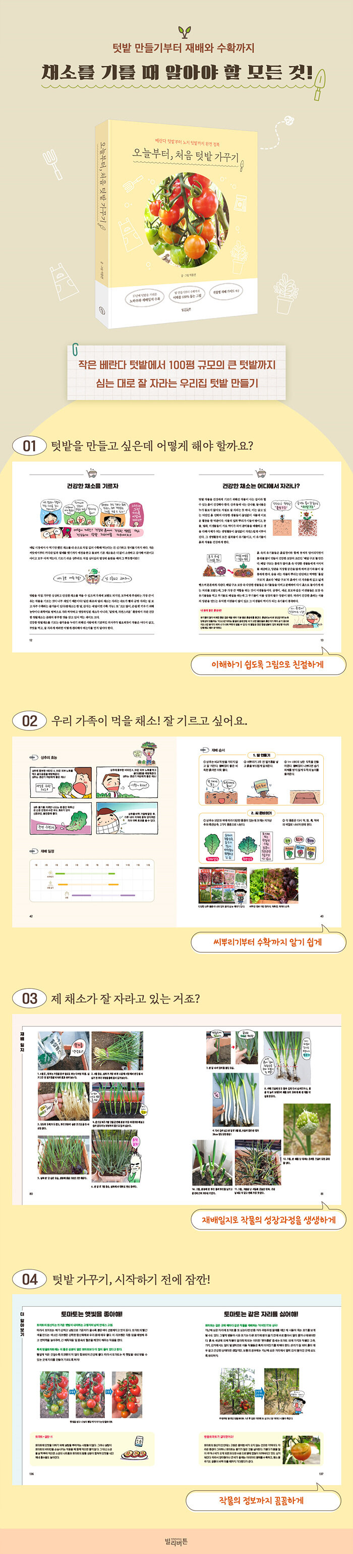ÅÔ¹çÀ» °¡²Ü ¶§ Áß¿äÇÑ °ÍÀº ¶§¿¡ ¸ÂÃß´Â °Í°ú ÀÛ¹°¿¡ ¸Â´Â ¹æ½ÄÀ¸·Î Ű¿ì´Â °ÍÀÌ´Ù. »ê¼º ¶¥¿¡¼ Àß ÀÚ¶óÁö ¸øÇÏ´Â ÀÛ¹°µµ ÀÖ°í, ºñ·á¸¦ ´õÇØÁÖÁö ¾Ê¾Æµµ ¾Ë¾Æ¼ Àß Å©´Â ÀÛ¹°µµ ÀÖ´Ù. ÀÌ Ã¥Àº ÀÛ¹°¿¡ ´ëÇÑ ¼¼¼¼ÇÑ Á¤º¸¿Í ÇÔ²² ¾¾¾ÑÀ» ½É´Â ¹æ¹ý, ºñ·á¸¦ ÁÖ´Â ¹æ¹ý, Æ÷±âÀÇ °£°Ý, Ⱥп¡ ½É¾úÀ» ¶§ ȺÐÀÇ Å©±â µîÀ» ²Ä²ÄÇÏ°Ô ¼³¸íÇϰí ÀÖ¾î ÅÔ¹ç Ãʺ¸µµ ½±°Ô µû¶ó ÇÒ ¼ö ÀÖ°Ô µµ¿ÍÁØ´Ù.