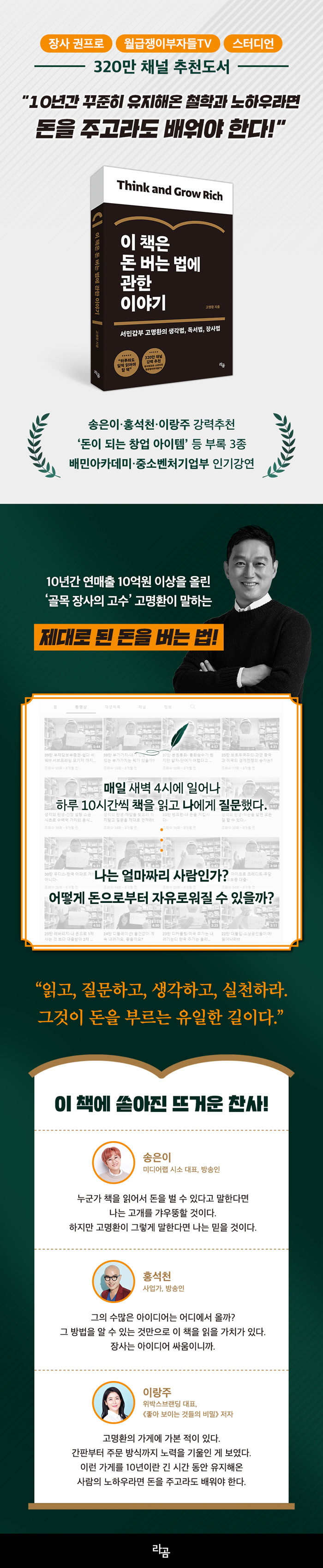 10³â°£ ²ÙÁØÈ÷ ¿¬¸ÅÃâ 10¾ï ¿ø ÀÌ»óÀ» ¸¸µå´Â ¡®°ñ¸ñ Àå»çÀÇ °í¼ö¡¯ÀÌÀÚ, Àå»ç-ÁýÇÊ-°¿¬-ÁøÇà-°ø¿¬ µîÀ¸·Î µ·ÀÇ ¼±¼øÈ¯À» ¸¸µé¾î ¡®µ·À¸·ÎºÎÅÍ ÇØ¹æµÈ ÀÚ¡¯. Àå»ç ±ÇÇÁ·Î, ¿ù±ÞÀïÀ̺ÎÀÚµéTV, ½ºÅ͵ð¾ð µî 320¸¸ ä³ÎÀÌ ÃßõÇÏ°í ¼ÛÀºÀÌ, È«¼®Ãµ, À̶ûÁÖ°¡ ¡°µ·À» ÁÖ°í¶óµµ ¹è¿ö¾ß ÇÑ´Ù¡±¸ç °·Â ÃßõÇÏ´Â ¡ºÀÌ Ã¥Àº µ· ¹ö´Â ¹ý¿¡ °üÇÑ À̾߱⡻ÀÇ ÀúÀÚ °í¸íȯÀ» ÀÏÄ´ ¸»ÀÌ´Ù. â¾÷ 2, 3³â ¸¸¿¡ ÇÁ·£Â÷ÀÌÁ ¼ö¹é °³¾¿ ¸¸µé°í µ·À» ¼ö½Ê¾ï¾¿ ¹ö´Â »ç¶÷µéÀÌ ÀÖ´Ù. ±×·¡¼ ÀúÀÚ°¡ Àå»ç¸¦ ½ÃÀÛÇßÀ» ¶§ ÁÖº¯ »ç¶÷µéÀº ¡®±×·¸°Ô ¹ú¾î¼ µÇ°Ú´À³Ä¡¯¸ç °ÆÁ¤Çß°í, ÀúÀÚ ¿ª½Ã ¡®³ª´Â ¿Ö Àú·¸°Ô ¸ø Çұ¶ó°í »ý°¢Çϱ⵵ Çß´Ù. ÇÏÁö¸¸ 20´ë¿¡ Çã¸ÁÇÑ µ·À» ¹ú¾îº» °æÇè, 30´ë¿¡ ½ÇÆÐÇÑ ³× ¹øÀÇ »ç¾÷Àº Àý´ë µ·ÀÌ ÇÑ ¹ø¿¡ ¡®Ä硯 ÇÏ°í ¹ú¾îÁöÁö ¾Ê´Â´Ù´Â °ÍÀ» ¾Ë·ÁÁá´Ù. ÀڽŸ¸ÀÇ ¼Óµµ¸¦ ã°í, ±× ¼Óµµ·Î °è¼Ó ³ª¾Æ°¥ ¼ö ÀÖ´Â ÈûÀ» ¸¸µå´Â °Í. ±×°ÍÀÌ ºÎÀÇ ¼±¼øÈ¯À» ¸¸µå´Â À¯ÀÏÇÑ ±æÀ̾ú´Ù.