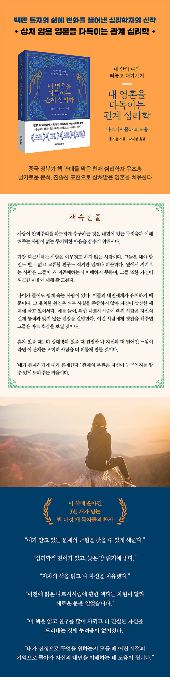 Áß±¹¿¡´Â õÀç ½É¸®ÇÐÀÚ ¿ìÁîÈËÀÌ ÀÖ´Ù. ±×°¡ 2017³â¿¡ Ãâ°£ÇÑ Áß±¹ÀÎÀÇ ±¹¹Î¼ºÀ» ÆÄÇìÄ£ Ã¥Àº ±× ³¯Ä«·Î¿î ÅëÂû·Â°ú ¿µÇâ·ÂÀ¸·Î Á¤ºÎ°¡ ÆÇ¸Å¸¦ ±ÝÁöÇÒ Á¤µµ¿´´Ù. ±×´Â ¿¬±¸½Ç¿¡ ¾É¾Æ ´ÜÁö À̷и¸ ´Ù·ç´Â ÇÐÀÚ°¡ ¾Æ´Ï´Ù. ¡®¿ìÁîÈ˽ɸ®¼¾ÅÍ¡¯¸¦ â¸³ÇØ ½ÇÁ¦ ¼¿ ¼ö ¾øÀÌ ¸¹Àº »ç¶÷ÀÇ ¸¶À½À» ¾î·ç¸¸Á® ÀλýÀ» ¹Ù²Û ½ÇÀü º£Å×¶û ½É¸®»ó´ã°¡ÀÌ´Ù. ÀÌ ¼¾ÅÍ´Â Áß±¹ Àü¿ª ¾îµð¿¡¼³ª º¼ ¼ö ÀÖÀ» Á¤µµ·Î »ç¶÷µéÀÇ »ýȰ¿¡ ±í¼÷ÀÌ ½º¸çµé¾î ÀÖ´Ù. ¶ÇÇÑ ¼ö½Ê¸¸ ¼ö°»ýÀ» °Å´À¸° À¯¸í ½É¸®ÇÐ °»çÀ̱⵵ ÇÏ´Ù. À̹ø¿¡ ¿ìÁîÈËÀº ÀÚ½ÅÀÌ 20¿© ³â°£ ¿¬±¸ÇÑ ½É¸®ÇÐÀû ±ú´ÞÀ½ÀÇ Á¤¼ö¸¦ ¸ð¾Æ ¡¶³» ¾ÈÀÇ ³ª¿Í Åͳõ°í ´ëÈÇϱ⡷ ½Ã¸®Á Ãâ°£Çß´Ù. »ì¾Æ°¡´Â µ¥ Áß¿äÇÑ ÁÖÁ¦ÀÎ ¿Ü·Î¿ò, ³ª¸£½Ã½ÃÁò, ²Þ, ¼ºÀå µî ³× °¡Áö¸¦ ¼±º°ÇØ ³ª´ä°Ô »ì¾Æ°¥ ¼ö ÀÖ°Ô ÀÚ½ÅÀÇ ³»¸é¼¼°è¸¦ Ž»öÇÒ ¼ö ÀÖ°Ô µ½´Â´Ù.