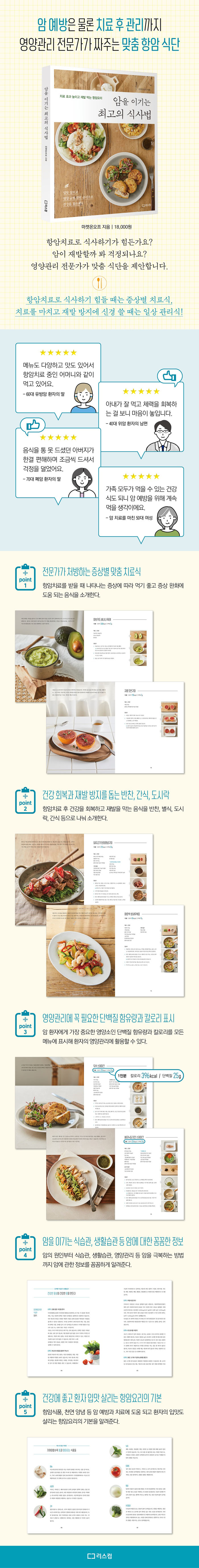 ¿µ¾çÇÐ Àü¹®°¡µéÀÌ Ä¡·á È¿°ú¸¦ ³ôÀ̰í Àç¹ßÀ» ¸·´Â À½½ÄµéÀ» ¡®Áõ»óº° Ä¡·á½Ä¡¯°ú ¡®ÀÏ»ó °ü¸®½Ä¡¯À¸·Î ³ª´² ¼Ò°³ÇÑ´Ù. Áõ»óº° Ä¡·á½ÄÀº ½Ä¿åºÎÁø, ±¸Åä, ÀÔ°ú ¸ñÀÇ ÅëÁõ, ¼³»ç µîÀÇ Áõ»óÀÌ ÀÖÀ» ¶§ ¸Ô±â ÁÁ°í Áõ»óÀ» ¿ÏÈÇÏ´Â À½½ÄµéÀÌ´Ù. ¾Ï ¼ö¼úÀ» ¹Þ°Å³ª Ç×¾ÏÄ¡·á¸¦ ¹ÞÀ¸¸ç ½Ä»ç·Î Èûµé¾îÇϴ ȯÀڵ鿡°Ô µµ¿òÀÌ µÈ´Ù. ÀÏ»ó °ü¸®½ÄÀº ¾Ï Ä¡·á¸¦ ¸¶Ä¡°í Àç¹ß ¹æÁö¸¦ À§ÇØ ½Ä´ÜÀ» °í¹ÎÇÏ´Â »ç¶÷µéÀ» À§ÇÑ À½½ÄµéÀÌ´Ù. ¹ÝÂù, µµ½Ã¶ô, ÇÑ ±×¸© À½½Ä, °£½Ä µîÀ¸·Î ³ª´² ¼Ò°³ÇØ, ½Ä´ÜÀ» ±¸¼ºÇÏ°í »óȲ¿¡ ¸Â°Ô Ȱ¿ëÇÒ ¼ö ÀÖ´Ù. Ç×¾Ï Ä¡·á ÁßÀΠȯÀÚ´Â ºÎÀÛ¿ëÀÌ ÀÖÀ» ¶§ Áõ»óº° Ä¡·á½ÄÀ¸·Î »ý±â¸¦ ãÀ» ¼ö ÀÖ°í, Ä¡·á¸¦ ¸¶Ä£ ¾Ï °æÇèÀÚ¶ó¸é ÀÏ»ó °ü¸®½ÄÀ¸·Î ºü¸£°Ô ÀÏ»ó»ýȰ·Î µ¹¾Æ°¥ ¼ö ÀÖ´Ù.