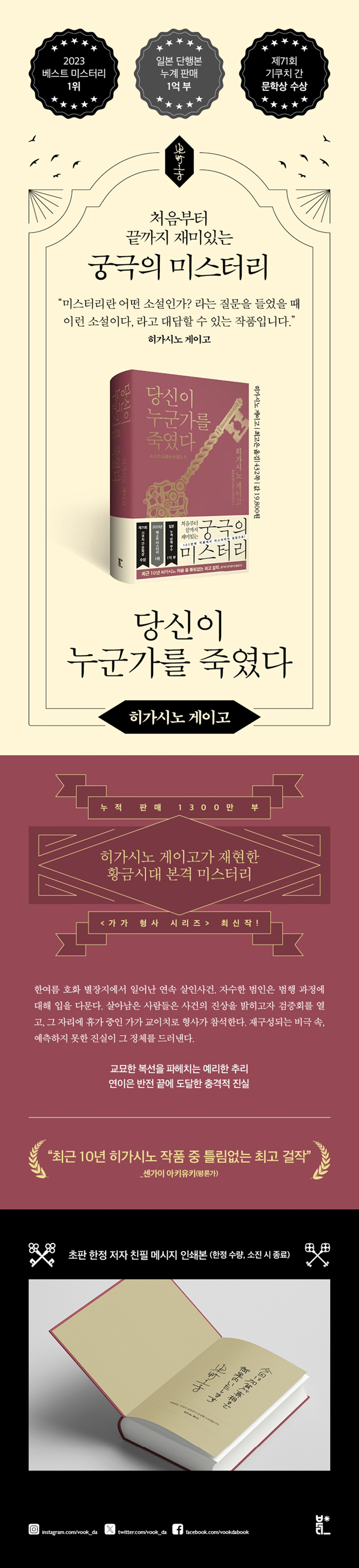 ÀϺ» ÃÖ°íÀÇ º£½ºÆ®¼¿·¯ ÀÛ°¡ È÷°¡½Ã³ë °ÔÀ̰íÀÇ ÃֽŠÀåÆí¼Ò¼³¡º´ç½ÅÀÌ ´©±º°¡¸¦ Á׿´´Ù¡»°¡ ºÏ´Ù¿¡¼ Ãâ°£µÇ¾ú´Ù. ÀÛǰÀº À帣¹®ÇаèÀÇ °ÅÀåÀÎ ÀÛ°¡°¡ 101¹øÂ° ÀÛǰÀ» ¸Â¾Æ Ã߸®¼Ò¼³ÀÇ ¿øÁ¡À¸·Î µ¹¾Æ°¡ ¡®È²±Ý½Ã´ë ¹Ì½ºÅ͸®¡¯ÀÇ ¸Å·ÂÀ» À¯°¨¾øÀÌ ¹ßÈÖÇÑ °ÉÀÛÀ¸·Î Æò´Ü°ú µ¶ÀÚÀÇ È£ÆòÀ» ¹Þ°í ÀÖ´Ù. 1986³â ¹ßÇ¥µÈ ¡ºÁ¹¾÷¡»À» ½ÃÀÛÀ¸·Î ÀåÀå 38³â° À̾îÁø È÷°¡½Ã³ë °ÔÀÌ°í ¹Ì½ºÅ͸®ÀÇ Á¤¼öÀÎ ¡´°¡°¡ Çü»ç ½Ã¸®Á ¿µÎ ¹øÂ° ÀÛǰÀ̱⵵ ÇÑ ½ÅÀÛÀº, 2023³â Ãâ°£ Áï½Ã ÀϺ» ¼Á¡ ¹Ì½ºÅ͸® ÆÇ¸Å Àüü 1À§¸¦ ¼®±ÇÇÏ¸ç ¼¼¿ùÀÌ Áö³ªµµ º¯Ä¡ ¾Ê´Â ½Ã¸®ÁîÀÇ Àα⸦ Áõ¸íÇß´Ù.