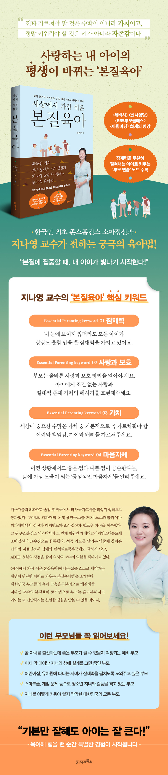 Çѱ¹ÀÎ ÃÖÃÊ Á¸½ºÈ©Å²½º ¼Ò¾ÆÁ¤½Å°ú ±³¼öÀÌÀÚ ÀÇ»ç·Î¼, Áö³ª¿µÀº 20³â °¡±îÀÌ ¼ö¸¹Àº ¾ÆÀÌ¿Í ºÎ¸ð¸¦ º¸¾Æ¿Ô´Ù. ´Ù¾çÇÑ ¹®Á¦¸¦ °Þ°í ÀÖ´Â ¿©·¯ °¡Á·ÀÇ »îÀ» ¹Ù¶óº¸¸é¼ °á±¹ ¡®»îÀÇ ±Ùº»À» º¸¿©ÁÖ´Â ºÎ¸ð¿Í »îÀ» ½º½º·Î °³Ã´ÇÏ´Â ¾ÆÀÌ¡¯¾ß¸»·Î À°¾ÆÀÇ ÃÖÁ¾ ¸ñÀûÁöÀ̸ç À̸¦ ÀÌ·ç±â À§Çؼ´Â º»Áú¿¡ ÃÊÁ¡À» ¸ÂÃá À°¾Æ°¡ ÇÊ¿äÇÔÀ» ±ú´Þ¾Ò´Ù. ¿½ÉÈ÷ ¾ÆÀ̸¦ Ű¿ìÁö¸¸ Á¤¸» Áß¿äÇÑ ±³À°Àº Àذí ÀÖ´Â ºÎ¸ðµéÀ» À§ÇØ, ¹ü¶÷ÇÏ´Â À°¾Æ ¾ÆÄ«ÀÌºê ¼Ó¿¡¼ Á߽ɰú Çٽɸ¸ °ñ¶ó³»¾ú°í, ±× °á°ú¹°À» ¡º¼¼»ó¿¡¼ °¡Àå ½¬¿î º»ÁúÀ°¾Æ¡»¿¡ Áý´ë¼ºÇß´Ù.